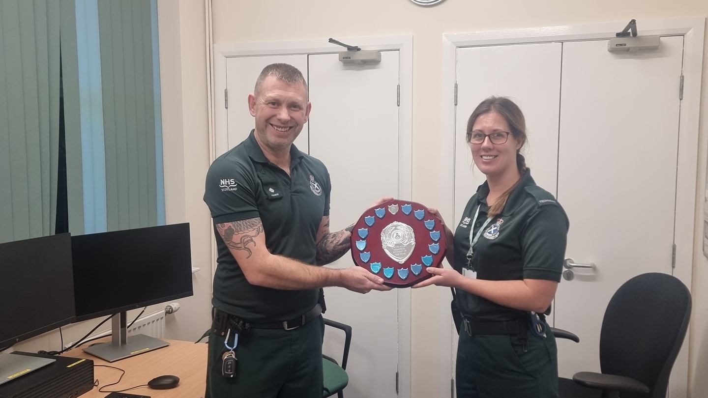 Local staff from across the Borders voted with three shortlisted finalists chosen. Jacques Kerr, his partner, recently visited Hawick to launch the award and thank staff for their support. The winner was Dawn Scott, who was unable to attend but was later presented with the trophy by Lee Myers, Paramedic Clinical Team Leader at Hawick.